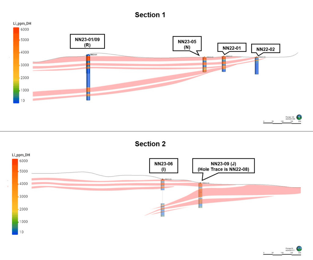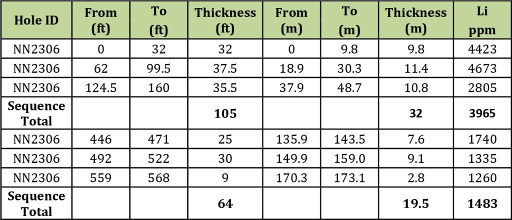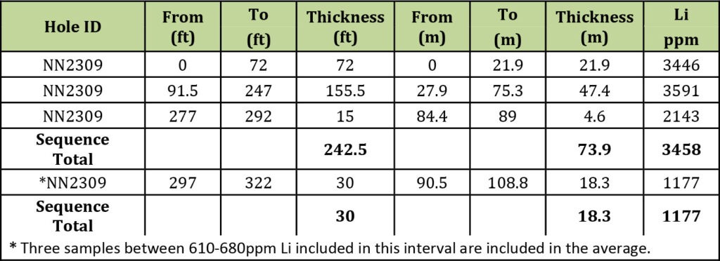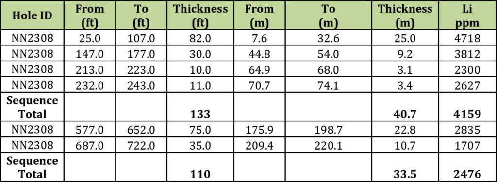 Mr. Greg Reimer, Chief Executive Officer, and Director commented “Today’s diamond drilling results, combined with previous sonic and RC results, are starting to outline a large volume of greater than 4000+ ppm Li within our upper clay horizon at the NNLP. Additionally, the deeper mineralization intersected in NN2308 is promising; it validates our interpretations and provides a critical exploration target in tracing this mineralization up dip to the east, where it is expected to approach the surface. Finally, the twinning of NN2208 bolsters our confidence in the assay results from the 2022 reverse circulation drilling. We look forward to following up these exciting results in the future.”