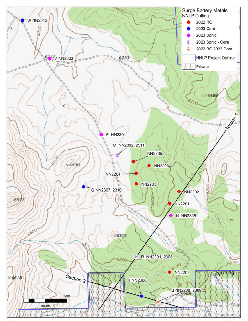 After the successful 2023 sonic drilling campaign at the NNLP, Surge proceeded with the diamond core drilling program. The maximum depth reached by sonic drilling was 107.5m, whereas diamond holes extended to 243m (NN2308). Diamond holes NN2306, NN2308 and NN2309 at the south end of the NNLP intercepted extended lithium clay mineralization west from the 2022 Reverse Circulation drilling, validated 2022 RC assay results, and encountered additional mineralization at depth. It is expected that deeper clay mineralization discovered in this round becomes shallower towards the east and adds to the already extensive near-surface lithium clay mineralization outlined by drilling thus far.