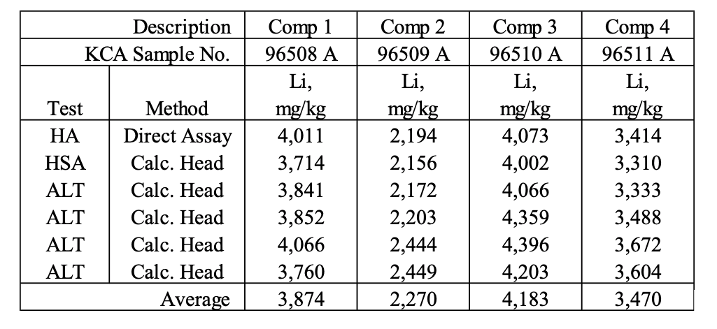 Table 1 Li grades from KCA.