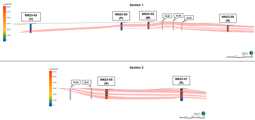 Figure 2: Cross section 1 and 2 showing 2023 sonic holes and 2022 RC holes coloured by assay with a working geological interpretation. Holes NN23-01 and NN23-02 were deepened using a diamond drill to test for additional clay mineralization at depth.