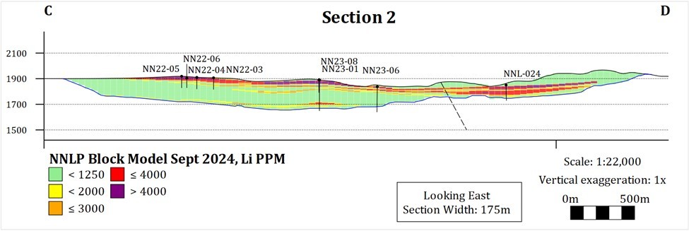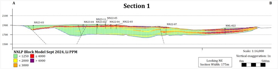 The RE for the NNLP is based on twenty-eight drill holes performed between 2022 and 2024 under a Notice of Intent (NOI) permit for a total of 4,039m and 2,700 composites. Sixteen of the twenty-eight drill holes were reverse circulation (RC), five were sonic, and seven were diamond core. The 3D geological model used to inform the block model was developed in Leapfrog™ through a collaborative effort with Surge Geologists and SideQuest Geological Modelling.