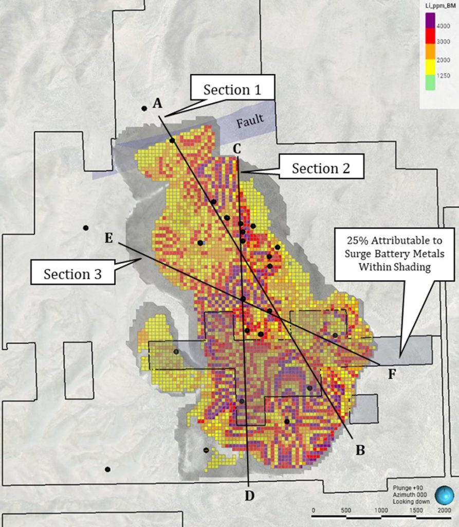 The inferred lithium mineral resource attributable to all subsurface mineral rights holders is shown in bold text in Table 1. The inferred lithium mineral resources attributable to Surge Battery Metals is shown in bold text in Table 2. The sensitivities to different cutoff grades up to a maximum of 4,000 ppm Li are also listed.